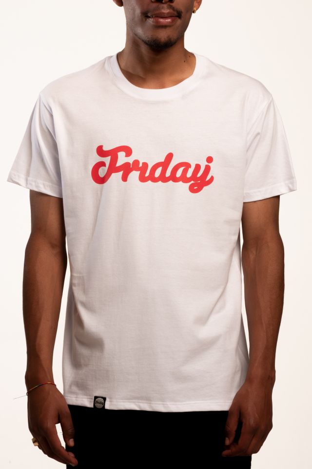 Fehér póló, elöl piros Friday logóval