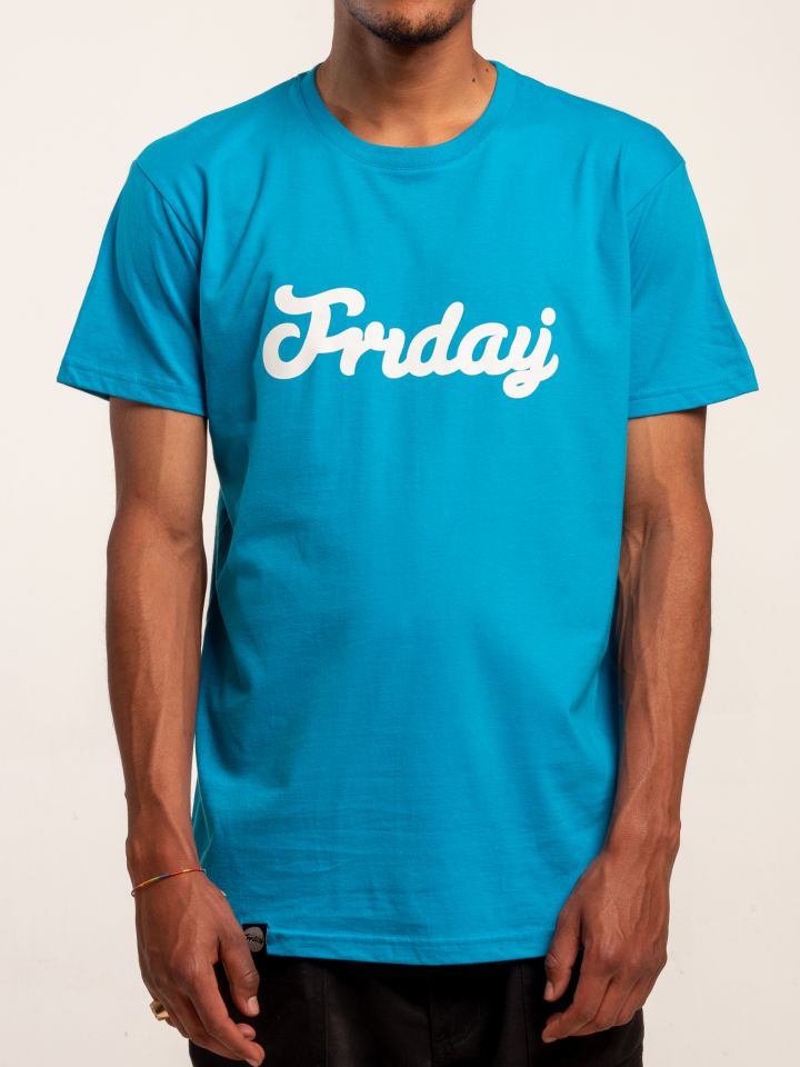 Kék póló, fehér Friday felirattal