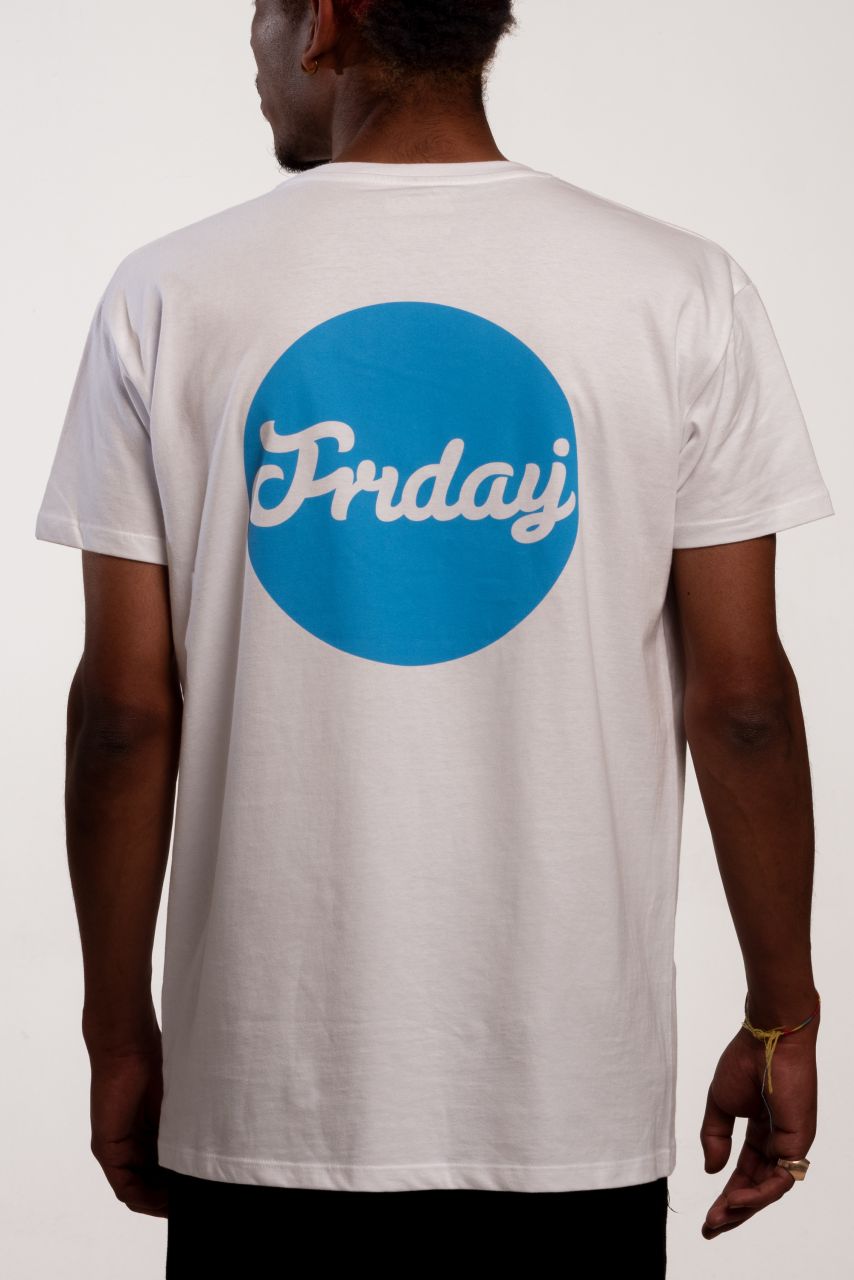 Fehér póló Friday logóval, hátul kék nagy körrel. A póló 100% pamut.