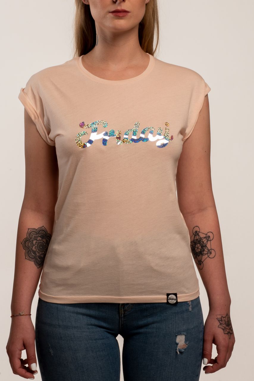 Rózsaszín női póló flitteres Friday felirattal az elején. A póló 100% pamut.