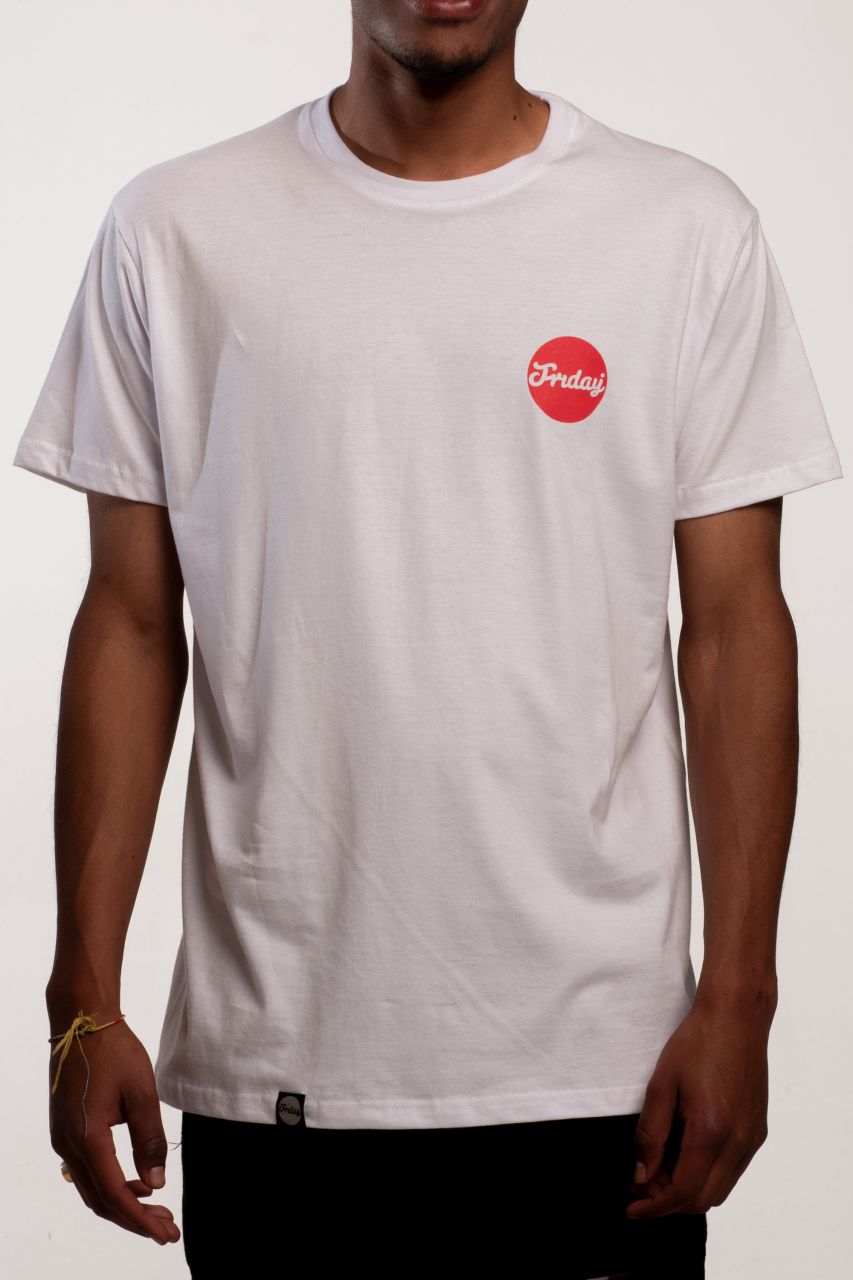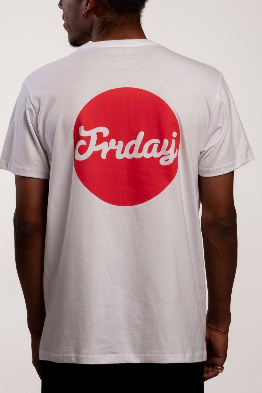 Fehér póló Friday logóval, hátul piros nagy körrel. A póló 100% pamut.